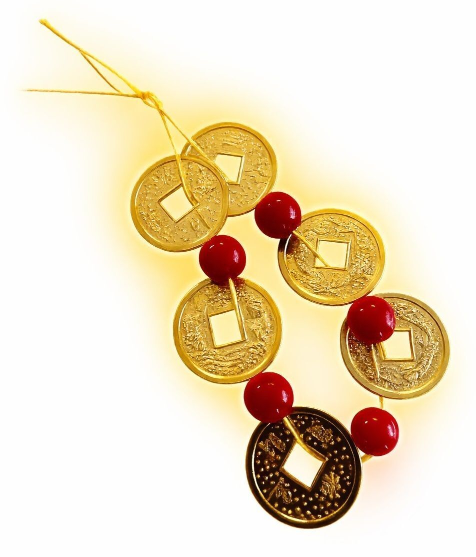 Selon les traditions chinoises les pièces de monnaies doivent être attachées avec des boules rouges, élément feu, pour activer la réussite et la prospérité.